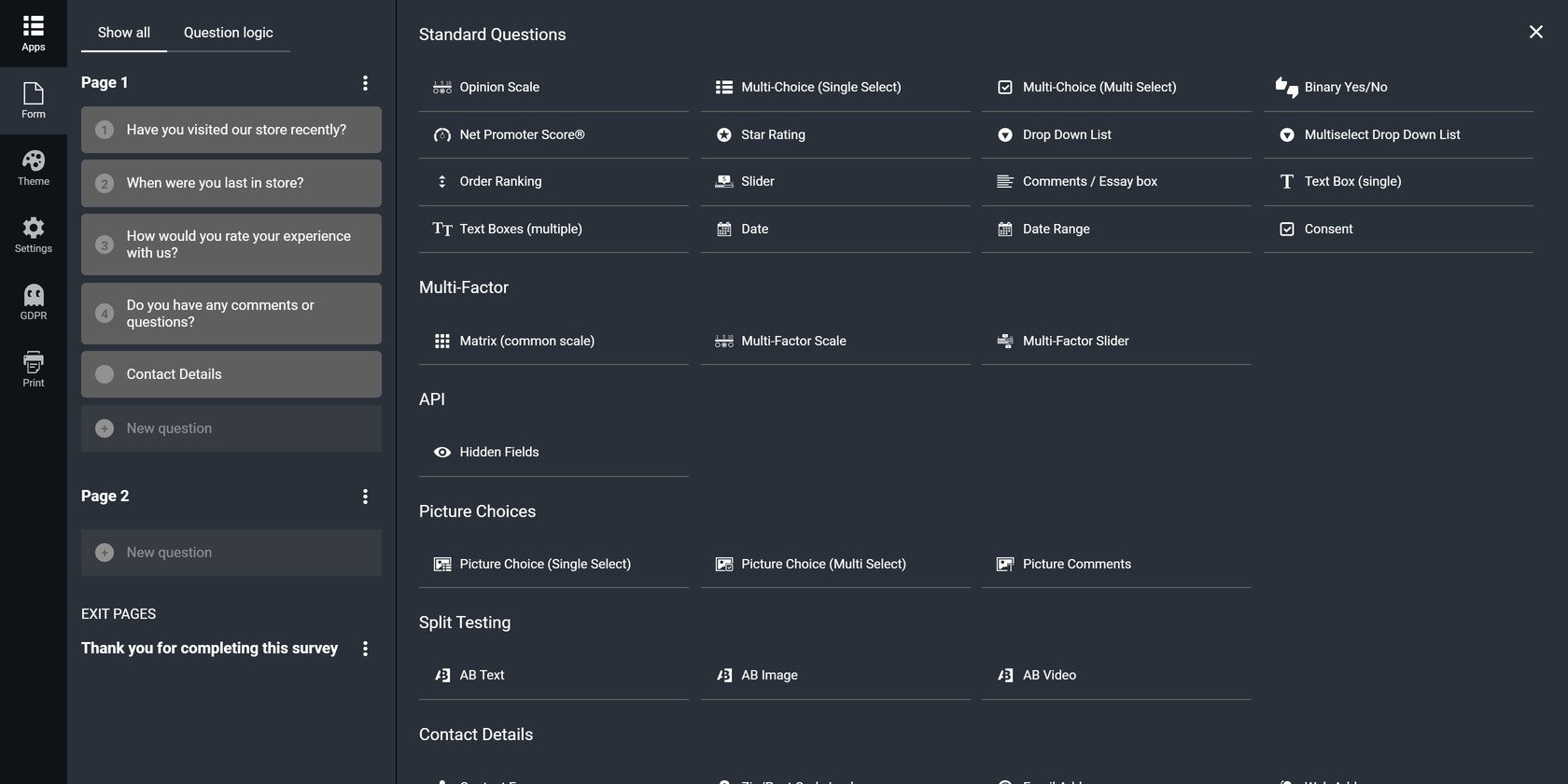 Sua nova pergunta será adicionada na parte inferior da página que estiver aberta no construtor. Temos um excelente documento de ajuda se você quiser saber mais sobre adicionar perguntas de pesquisa.